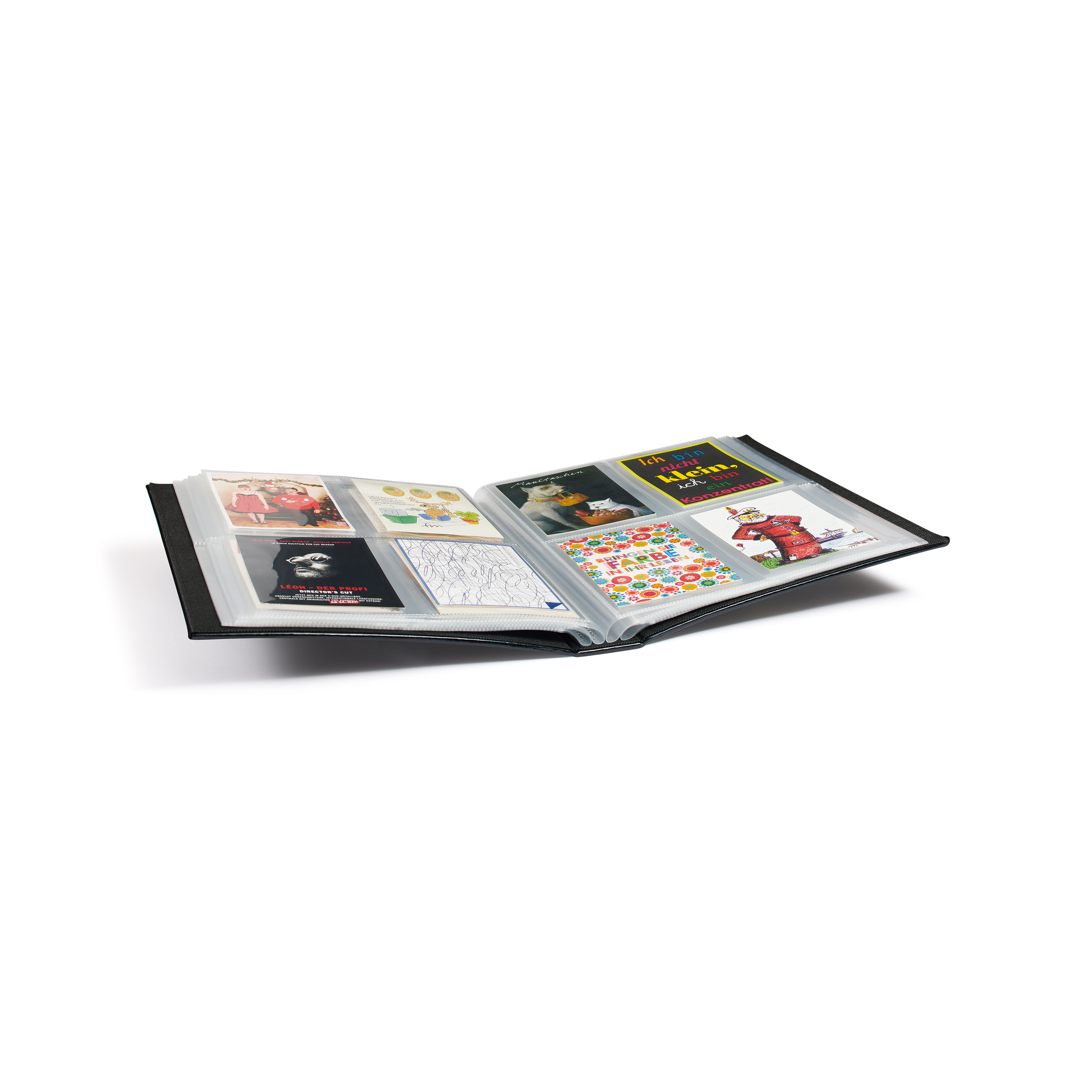 Album pour cartes postales avec 50 feuilles reliées transparentes pour classer 400 cartes postales jusqu’au format 162 x 114 mm. Chaque feuille permet de classer jusqu’à 8 cartes postales (avec chargement des 2 côtés). Finition de qualité avec bords cousus et reliure en simili cuir élégant. Couleur: noir. Format extérieur: 290 x 350 x 58 mm.