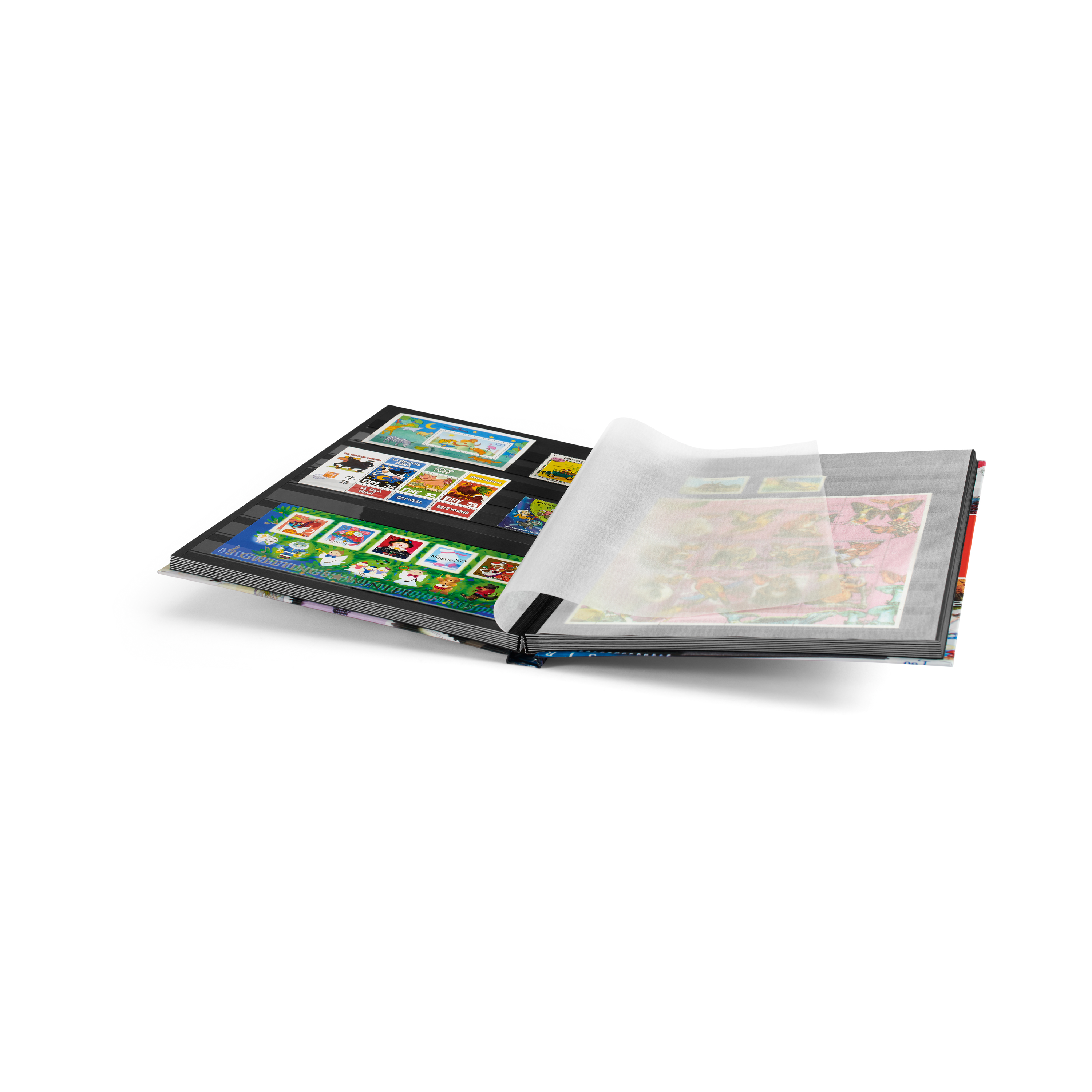 Classeur A4*, 16 ou 32 pages noires, couverture non-ouatinée et colorée avec banderole montre des timbres du monde, 9 bandes rhodoïd par page, double intercalaires cristal, articulation rigide, couleurs de banderole : bleu (S16), rouge (S32)