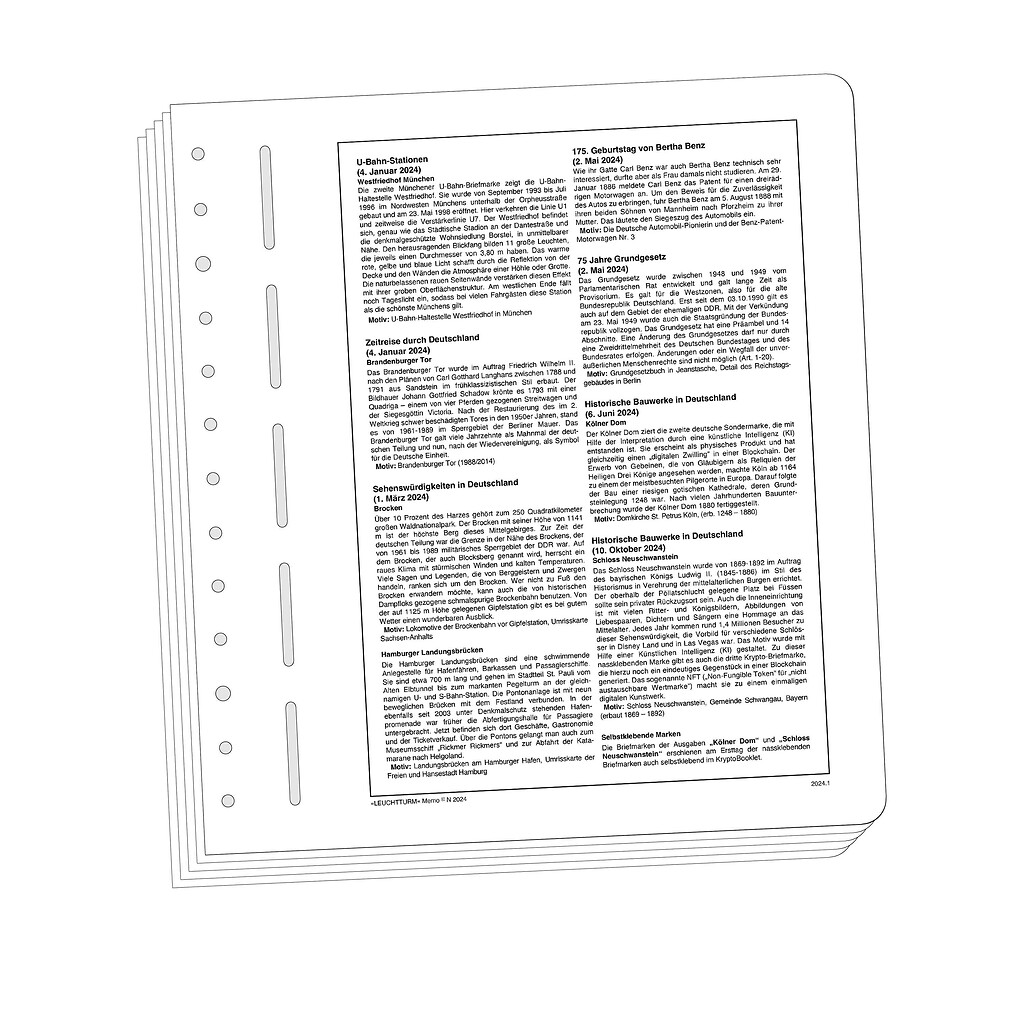 Les feuilles MEMO contient divers faits et données considerables sur les marques ainsi que des explications experimentés et des aspects historique importants, des particularités philatéliques et plus d'informations utiles.