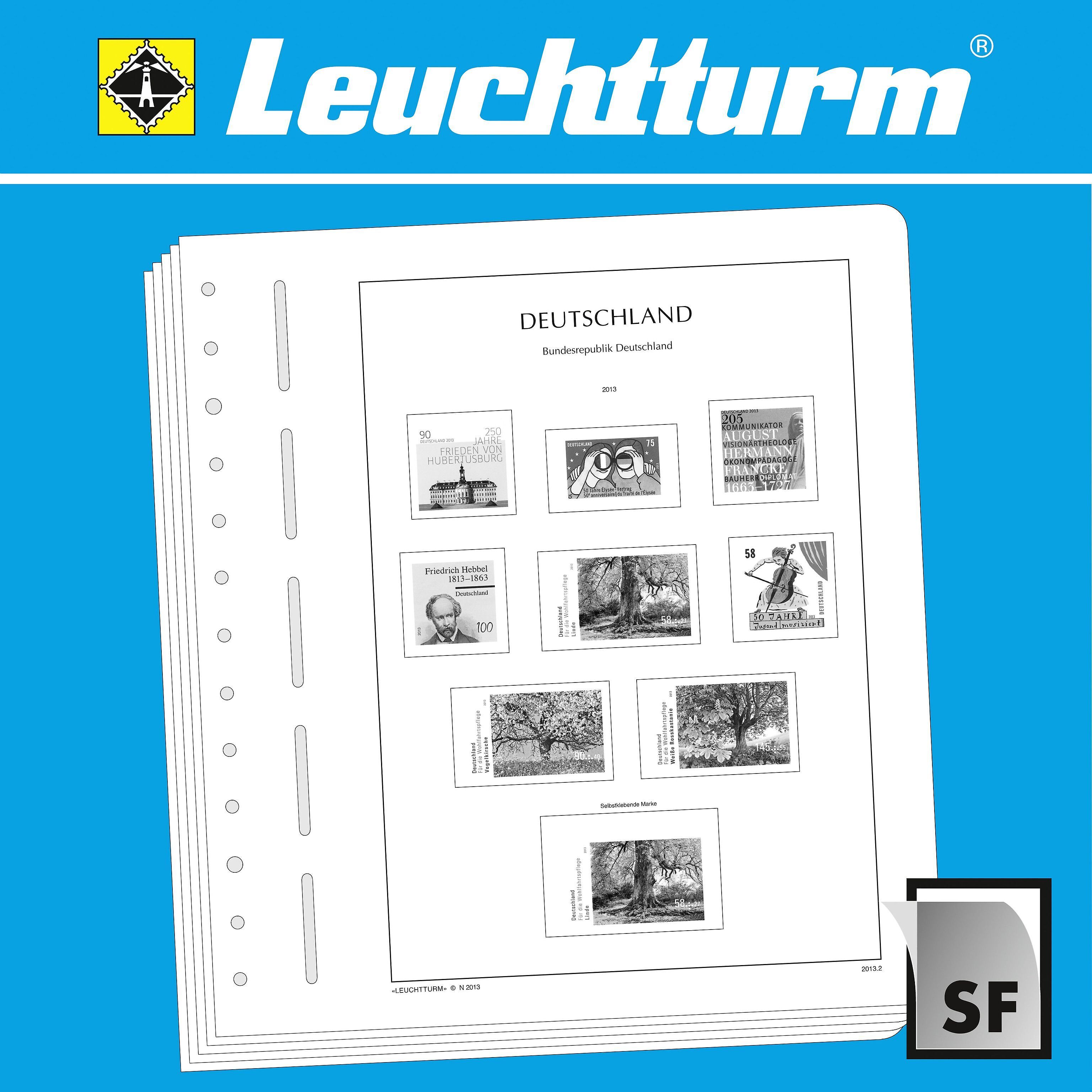Les feuilles LEUCHTTURM (format 270 x 297 mm / système à 13 trous) sont imprimées par offset, en noir et blanc, avec un grand souci de précision, sur du papier stable, sans bois ni acide (170 g/m 2 ). Nous renonçons volontairement à une impression en couleurs. Vous pouvez ainsi plus facilement savoir quels timbres manquent encore dans votre album. Des pochettes de protection, fabriquées à partir d'une feuille de polystyrène traitée anti-reflet, transparente et sans plastifiant acide, découpées au format des différents timbres, sont collées sur les pages des albums. Les pochettes de protection maintiennent les timbres bien en place, sans qu'il soit nécessaire de les coller. De plus, elles assurent une protection optimale contre la poussière et divers dommages.