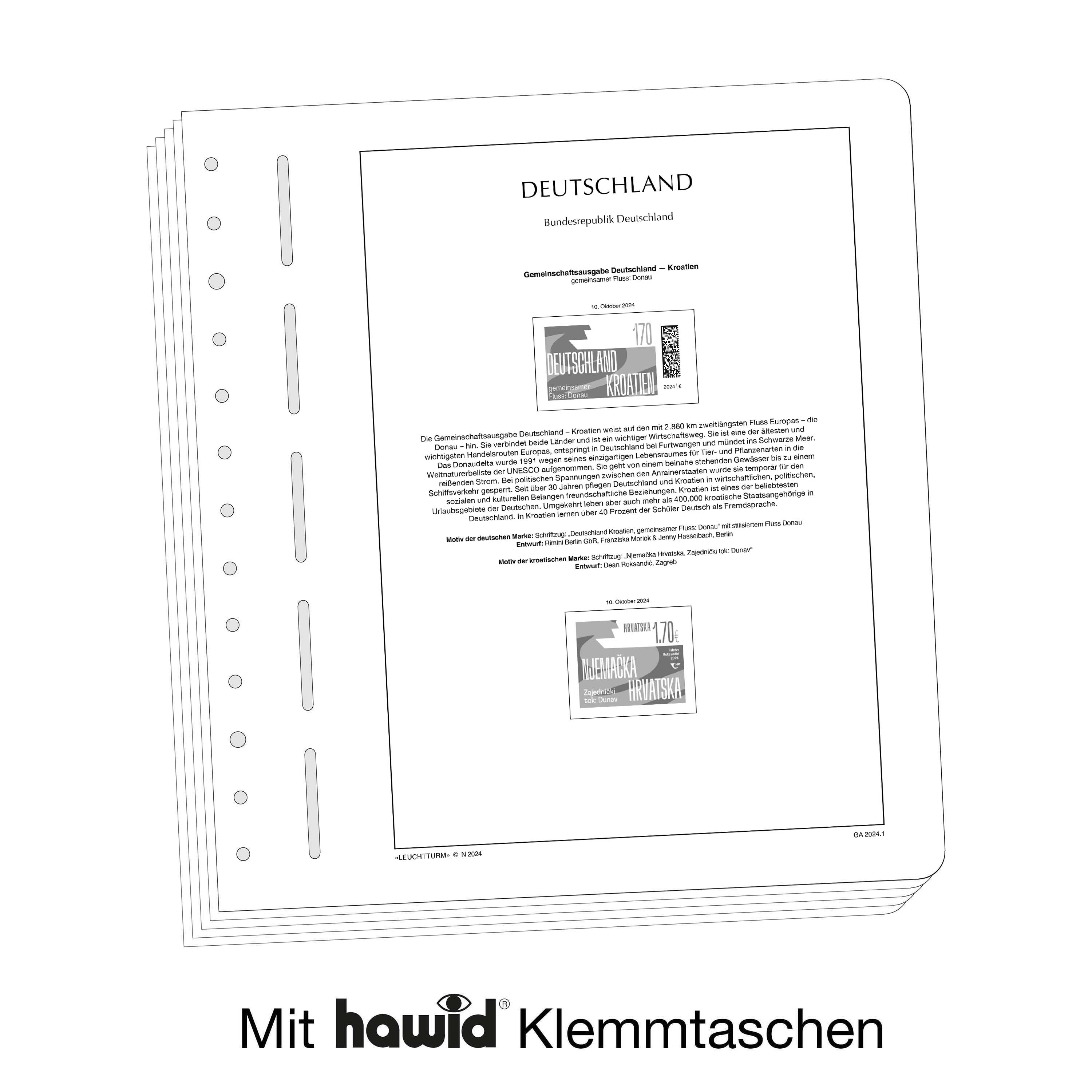 Les feuilles LEUCHTTURM (format 270 x 297 mm / système à 13 trous) sont imprimées par offset, en noir et blanc, avec un grand souci de précision, sur du papier stable, sans bois ni acide (170 g/m 2 ). Nous renonçons volontairement à une impression en couleurs. Vous pouvez ainsi plus facilement savoir quels timbres manquent encore dans votre album. Des pochettes de protection, fabriquées à partir d'une feuille de polystyrène traitée anti-reflet, transparente et sans plastifiant acide, découpées au format des différents timbres, sont collées sur les pages des albums. Les pochettes de protection maintiennent les timbres bien en place, sans qu'il soit nécessaire de les coller. De plus, elles assurent une protection optimale contre la poussière et divers dommages.