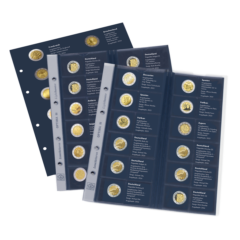 Nos fiches préimprimées présentent des illustrations et des informations détaillées sur l'année concernée. Elles sont spécialement conçues pour répondre aux besoins des numismates. Chaque set contient des feuilles au format 250 x 200 mm. Les fiches préimprimées comprennent des illustrations et des informations sur l'année concernée, en tenant compte des 5 marques d'atelier allemandes – à l'exception des émissions communautaires européennes de 2 euros. Tous les textes sont rédigés en allemand.