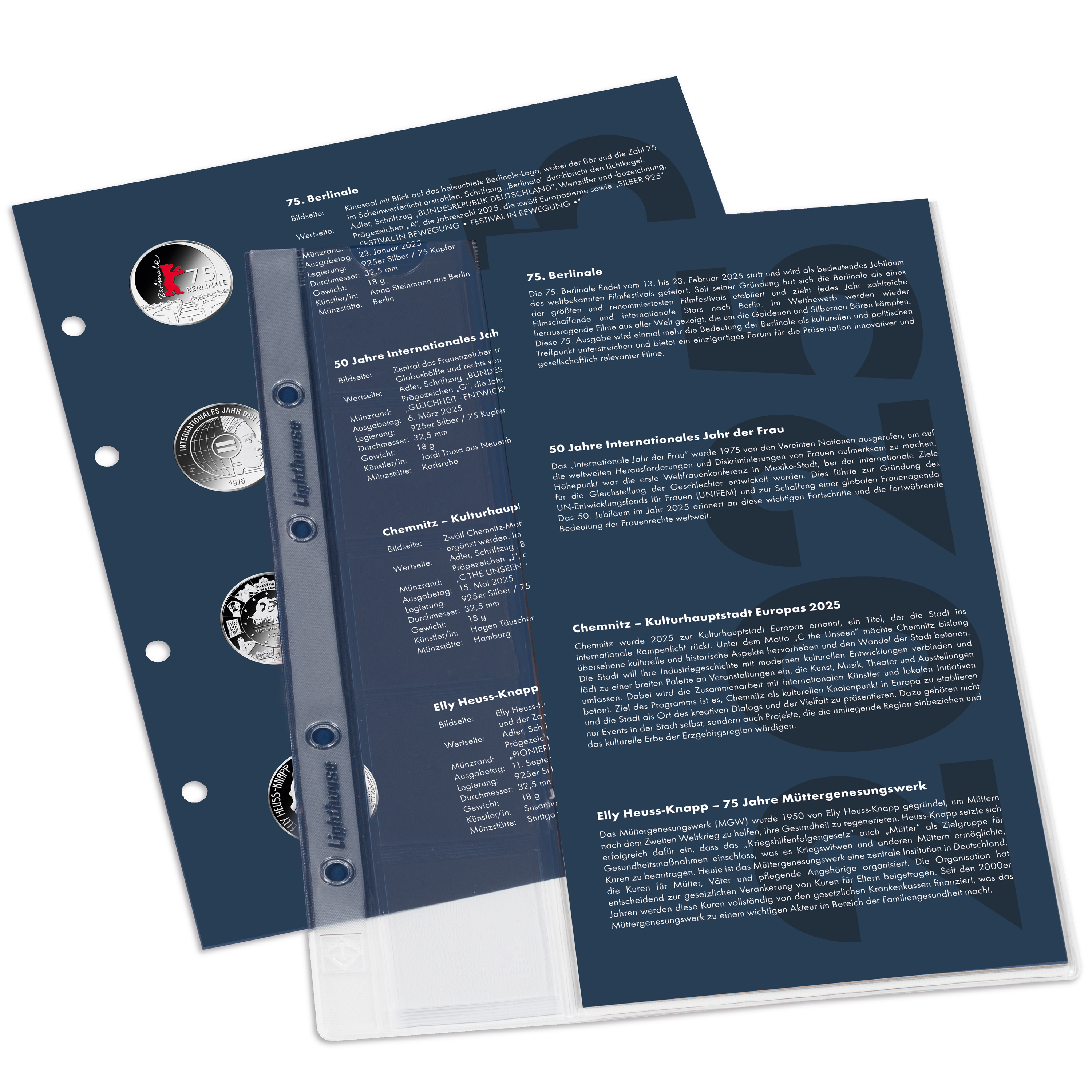 Nos fiches préimprimées présentent des illustrations et des informations détaillées sur l'année concernée. Elles sont spécialement conçues pour répondre aux besoins des numismates. Chaque set contient une feuille au format 250 x 200 mm. Les feuilles préimprimées comprennent des illustrations et informations sur chaque pièce. De plus, une feuille supplémentaire contient des informations de fond détaillées sur les émissions. Tous les textes sont rédigés en allemand.